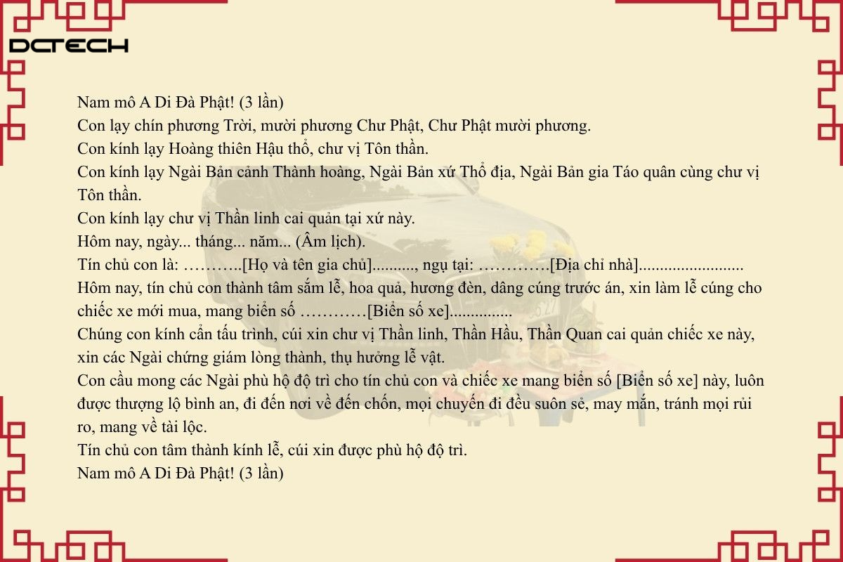 Con xin kính dâng lên chư vị Thần linh và Gia tiên tiền tổ, cầu xin phù hộ độ trì cho chiếc xe mang biển số (nếu có) … / nhãn hiệu …