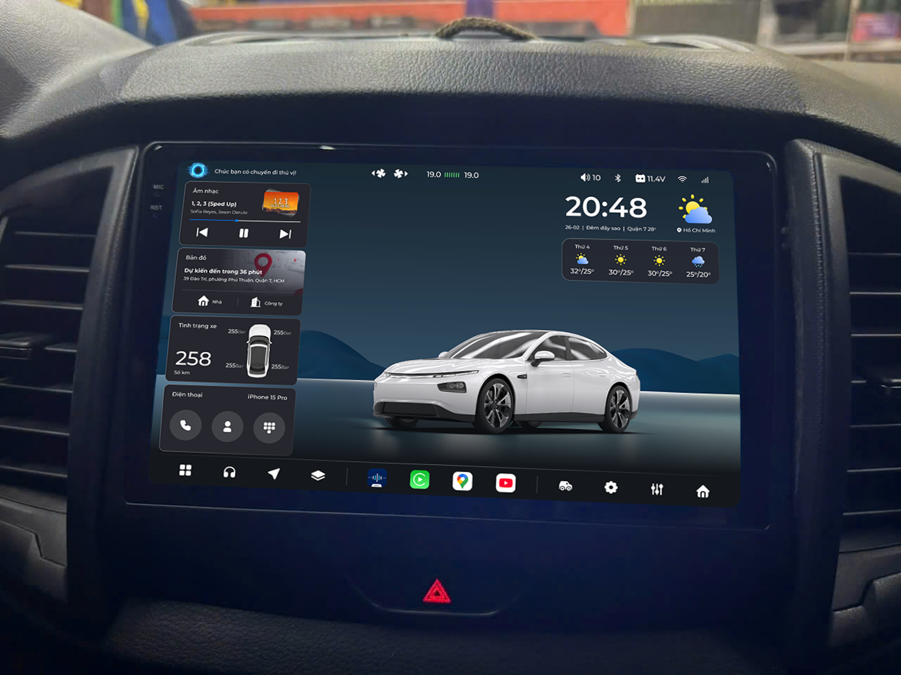 Trong nhóm tính năng “đáng giá” nhất, điều khiển giọng nói tiếng Việt giúp việc sử dụng màn hình Android an toàn hơn. Thay vì phải chạm tay liên tục vào màn hình cảm ứng, tài xế có thể ra lệnh bằng giọng nói để mở bản đồ, gọi điện, mở nhạc hoặc tìm địa điểm. Khi tay vẫn giữ vô lăng và mắt tập trung quan sát, hệ thống nhận lệnh và trả kết quả ngay trên màn hình, vừa nhanh vừa tiện. Đây là tính năng đặc biệt phù hợp khi bạn lái xe trong phố đông hoặc di chuyển đường dài cần thao tác liên tục.